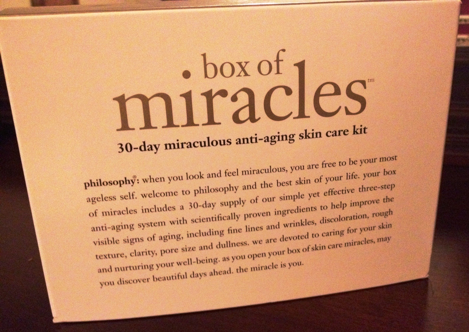 As you can see, there wasn’t anything terribly exciting or compelling about the video, but I still found myself ready to call and order. Perhaps it was because I already like Philosophy’s products, perhaps it was because it was a really good deal for what would retail as twice as much if I purchased them separately at Sephora, or perhaps it was because it was 4 am in the morning and I was convinced I could take 10 years off my skin. Maybe it’s because they said they would give me back my money if it didn’t like it.