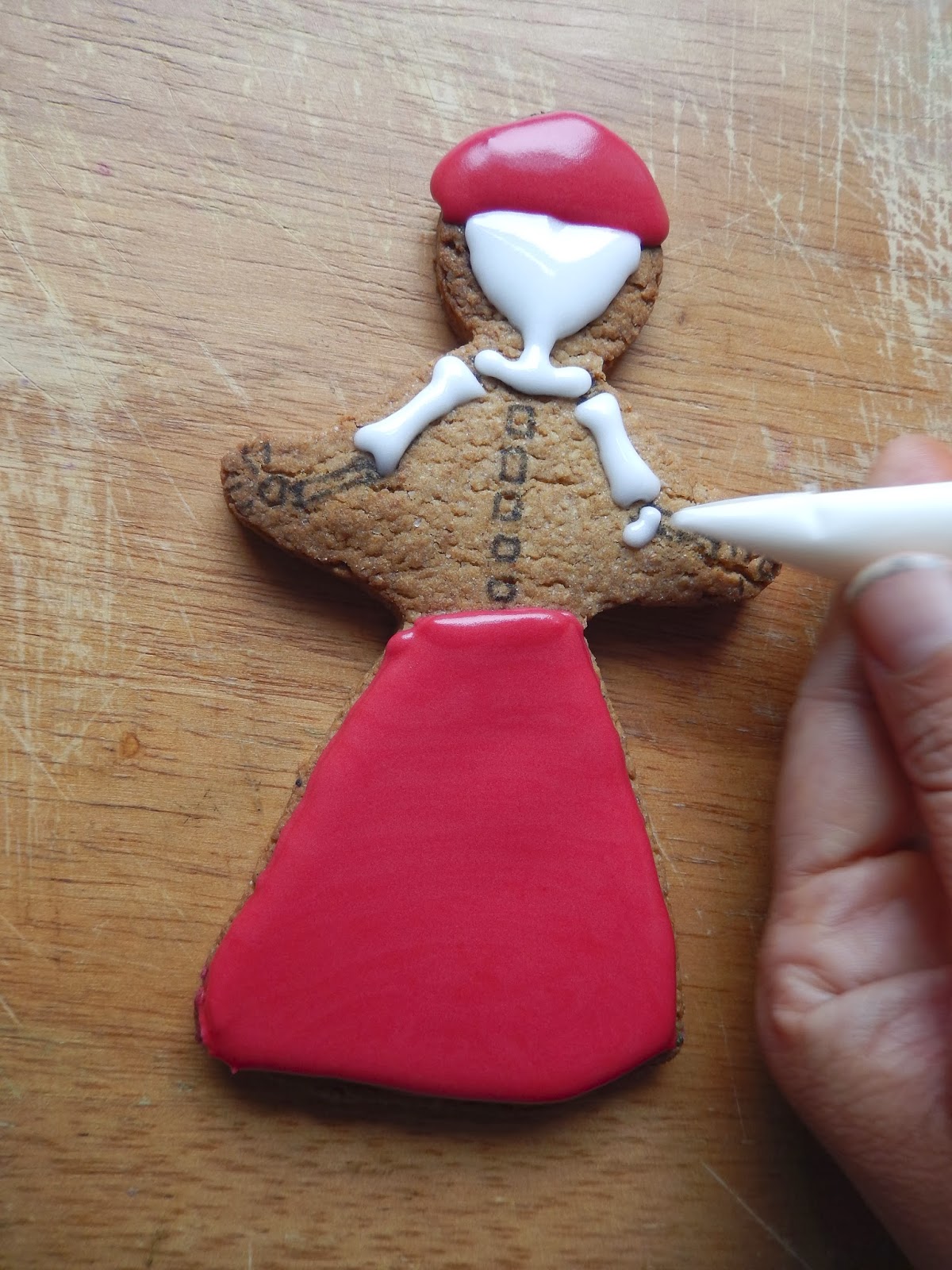 - Pick a color for the Royal Icing (red, green, or yellow) and use that color icing in a piping bag with a #3 tip to outline the skirt and hat. Once the icing sets, fill in the skirt and hat with the same color. Let the icing set.