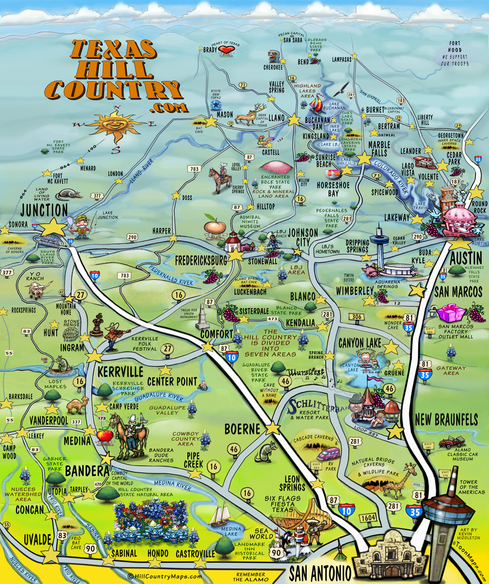 Take the scenic route… 281 from Stephenville into San Antonio. Not nearly as much traffic as 35, and you will get to pass some of the most beautiful Texas countryside. Marble Falls, prettiest views in the state, and the best pie at the Bluebonnet Cafe. Not too far away are the Longhorn Caverns.